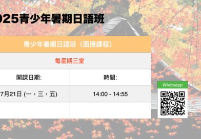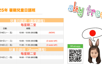 Read More2025 兒童日語暑期班加開7月18日新班! 2025 兒童日語暑期班(適合完全未學過日語 3 - 11 歲小朋友)[ 面授 ] 加開:7月18日逢星期一,五:下午 1200-1255 (NEW!) 7月21日逢星期一,三:下午 1300-1355 (2