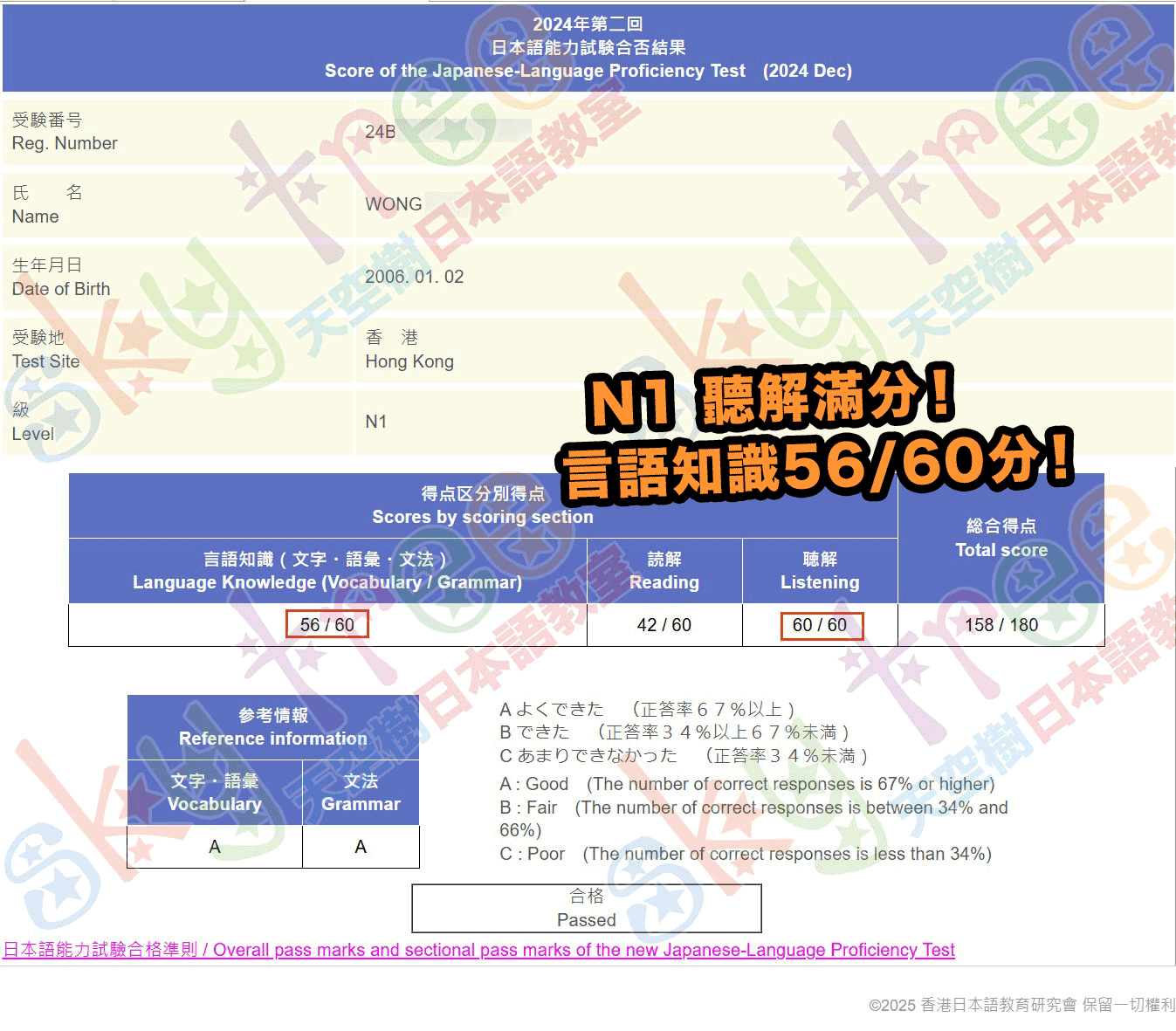 其他 2024年第2回 JLPT N1 聽解満点!! N3 文字,語彙,文法,聽解滿分!! 2025年Feb28日 skytree 2024年第2回日本語能力試成績 1位N1同學 聽解滿分!! 總分 158 另一位N3同學言語知識,聽解滿分!! お疲れ様でした!繼續努力加油! 考試成績如下: 18歲 N1 158/180 聽解滿分 15歲 N3 166/180 文字,語彙,文法,聽解滿分 Share this: Click to share on Facebook (Opens in new window) Facebook Click to share on X (Opens in new window) X Click to share on WhatsApp (Opens in new window) WhatsApp Click to email a link to a friend (Opens in new window) Email Click to print (Opens in new window) Print Like this:Like Loading... Related